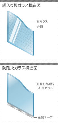 火災時に破損しても、金属の網がガラスの脱落を防ぎ、火炎の侵入を抑えます。