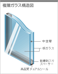 複層ガラスは、スペーサーと呼ばれる金属部材で、2枚のガラスの間に中空層を持たせたガラスです。スペーサーを用いて保たれた空間には、乾燥空気を封入してあります。