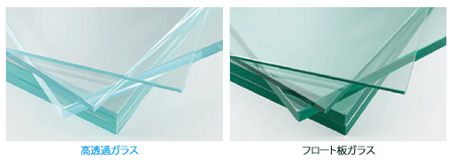 高透過ガラスはフロート板ガラスに比べて特有の青みをおさえて、可視光透過率を高めます。特に厚板を使用する場合、透明感の違いは歴然です。