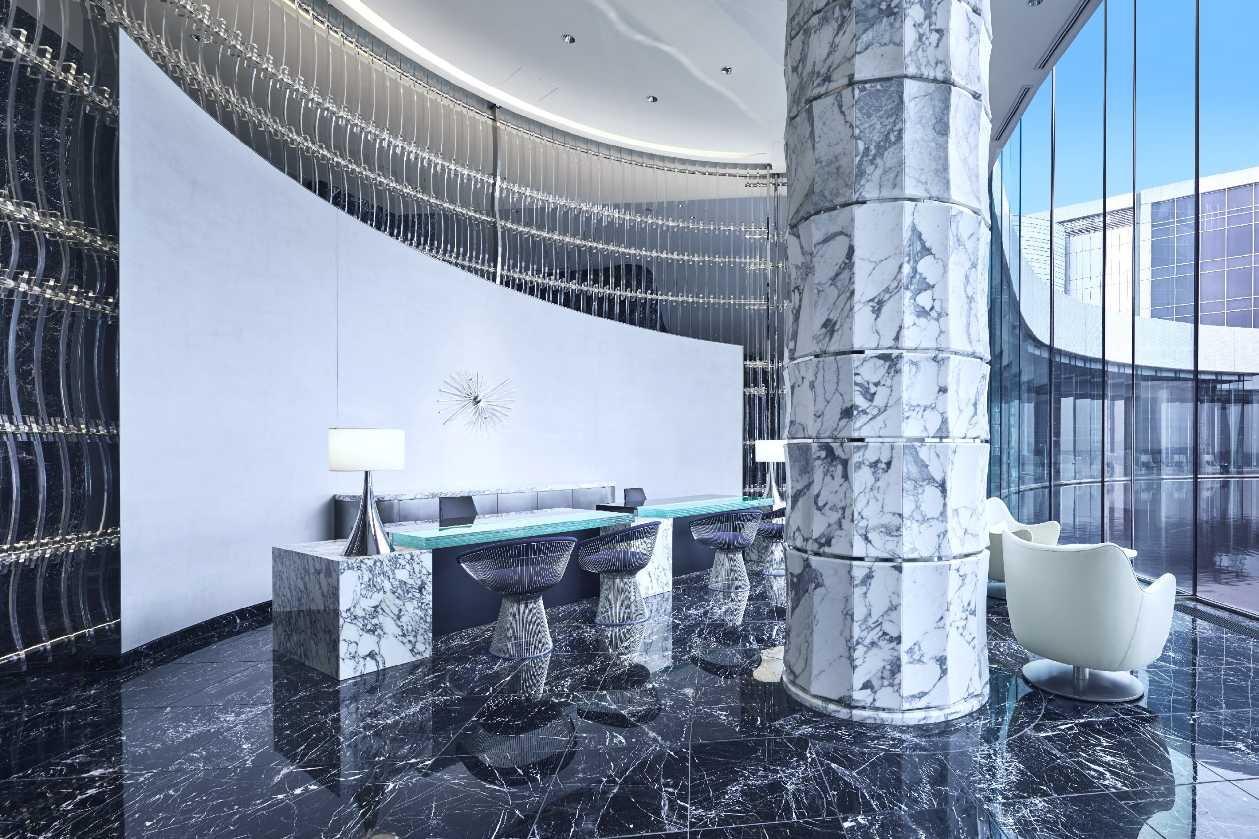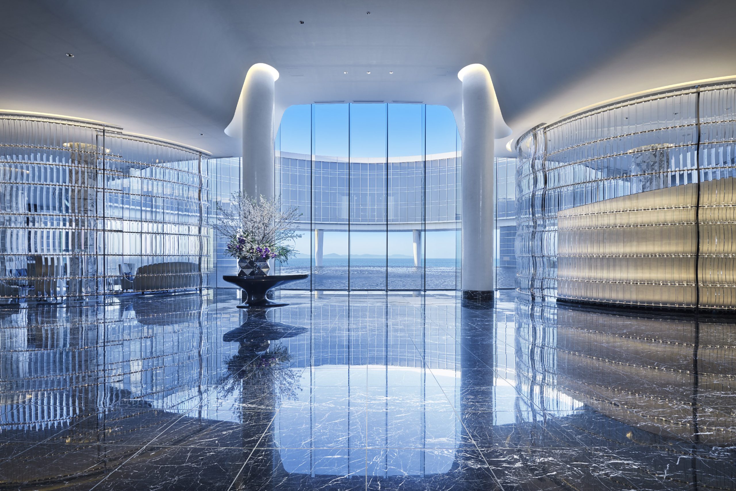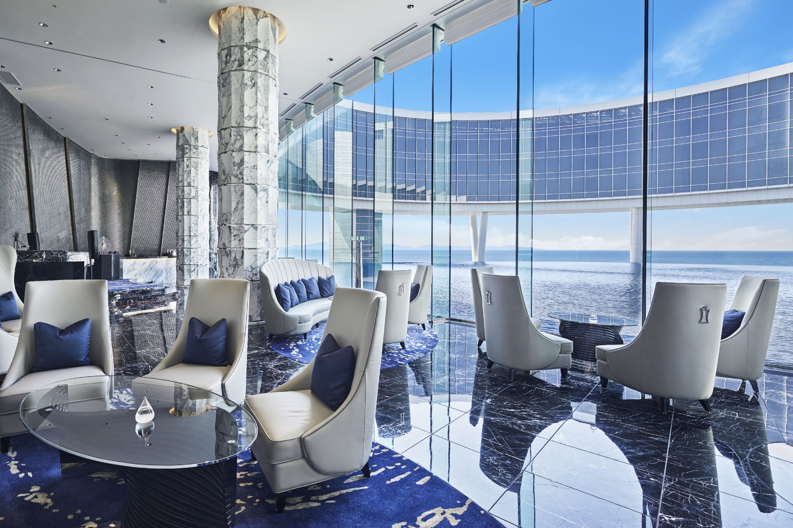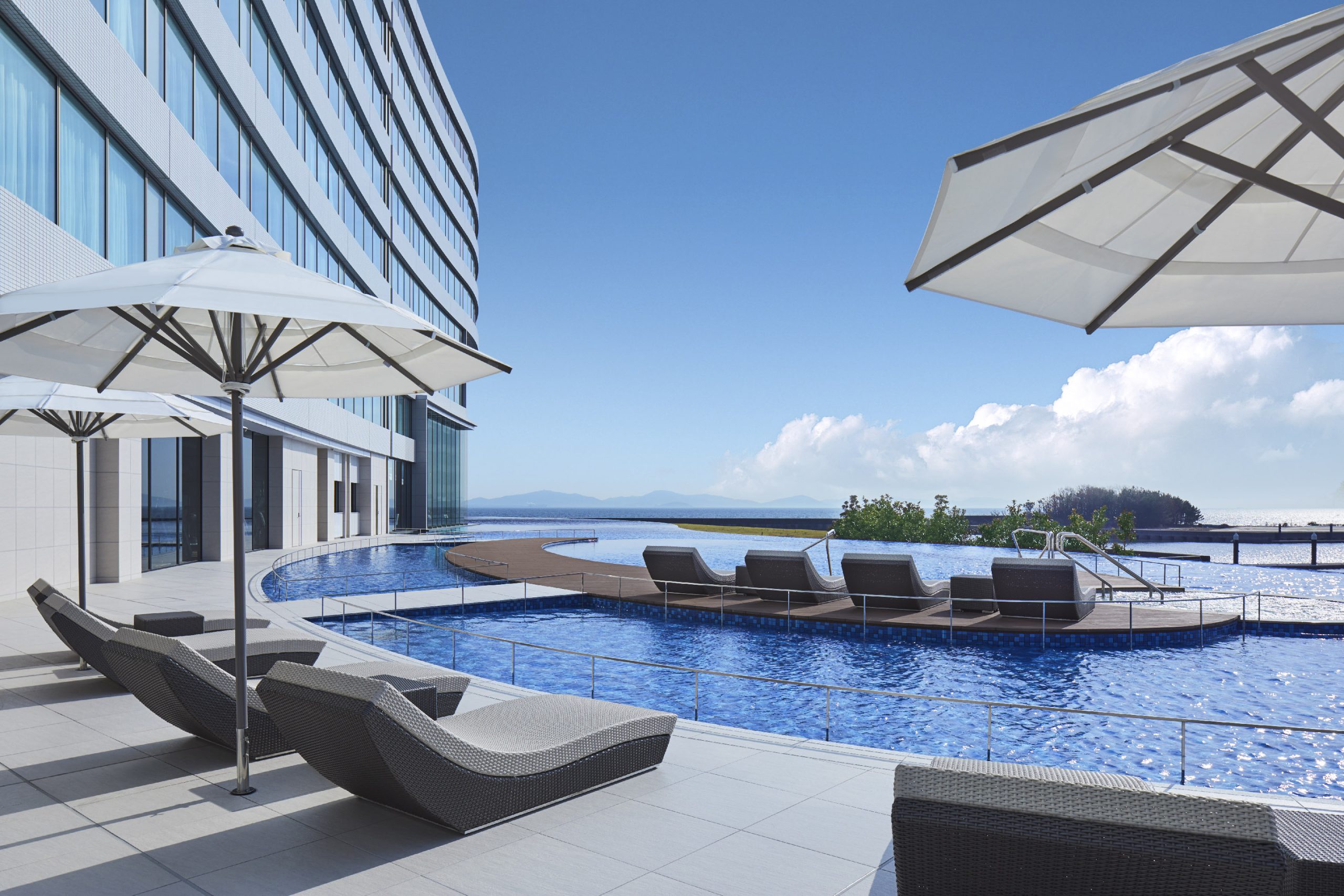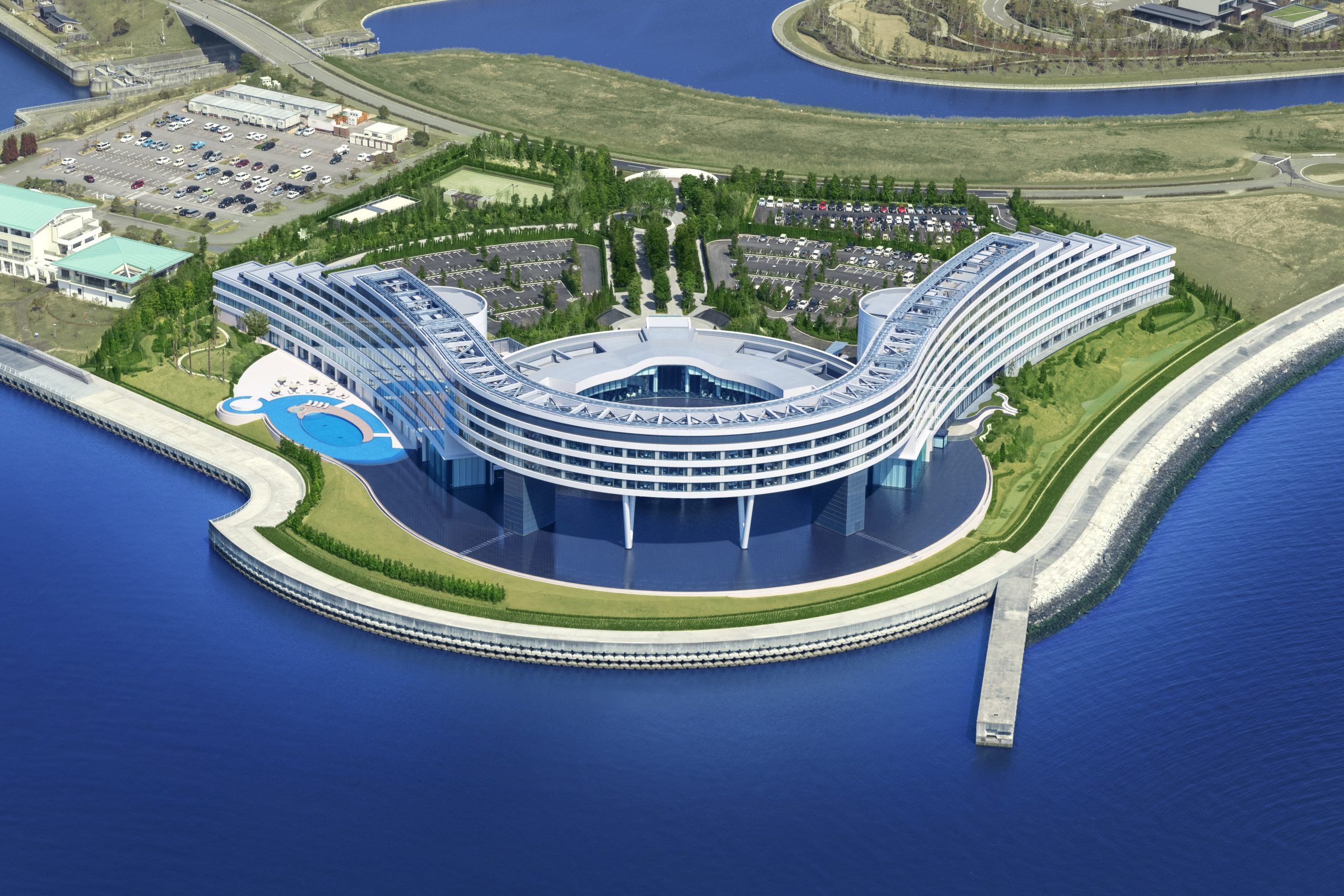 テーマパークのラグナシア、ヨットハーバー、アウトレット、レストランなどの施設があるラグーナテンボスのエリアにリゾートトラスト株式会社が運営する完全会員制リゾートホテル「ラグーナベイコート倶楽部 ホテル&スパリゾート」が誕生しました。総延長400mの建物は海岸線のカーブに沿って配置し、海との一体感のある建物としています。窓ガラスには、デザインと安全性より、グレー中間膜を使用したLow-E(ペアマルチEA)合わせガラスが採用され、落ち着いた空間を演出しています。