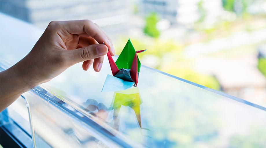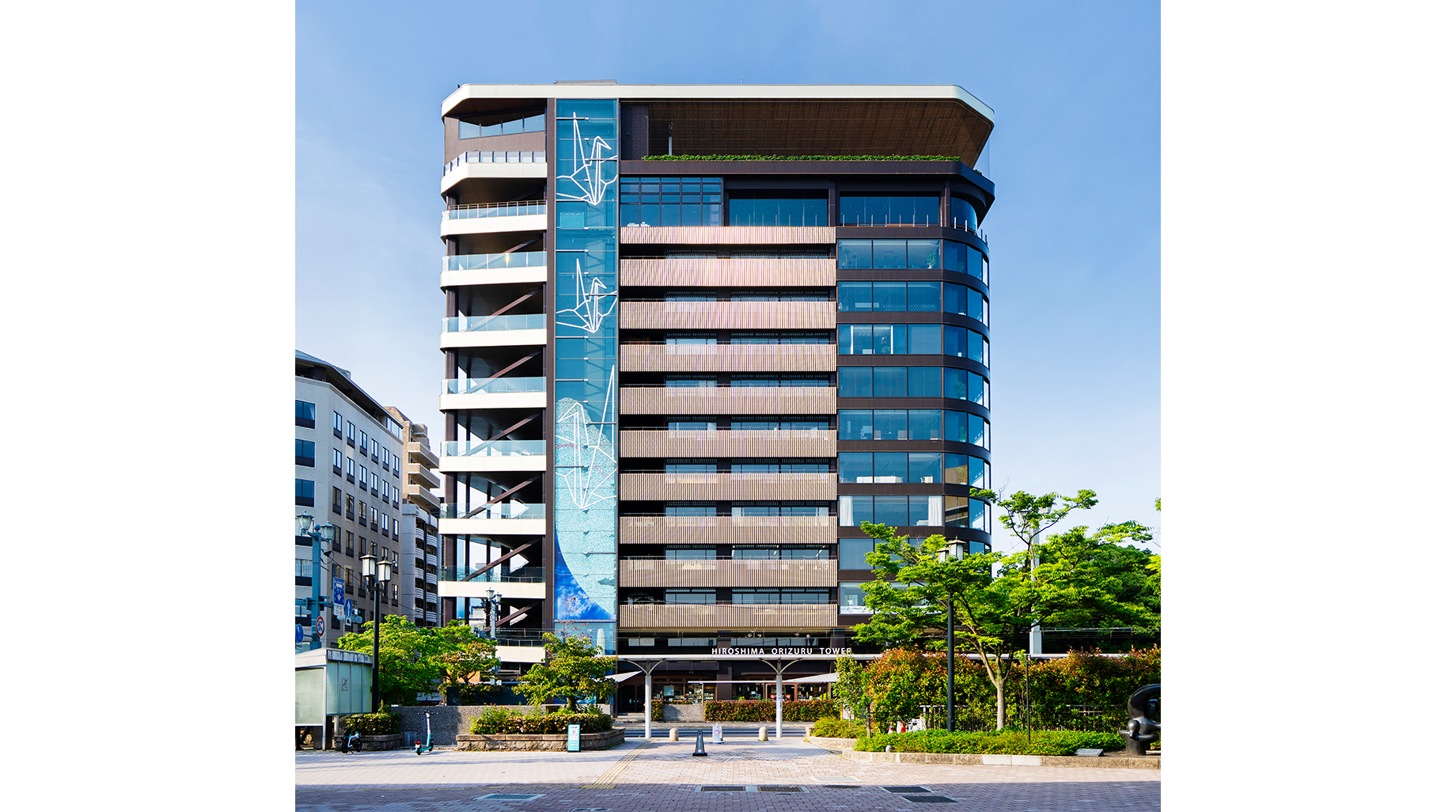 原爆ドーム(世界遺産)の東隣で改修していた複合商業施設「おりづるタワー」が2016年9月に竣工しました。タワーの12階には来館者が折ったおりづるを投入することができる「おりづるの壁」が設けられています。