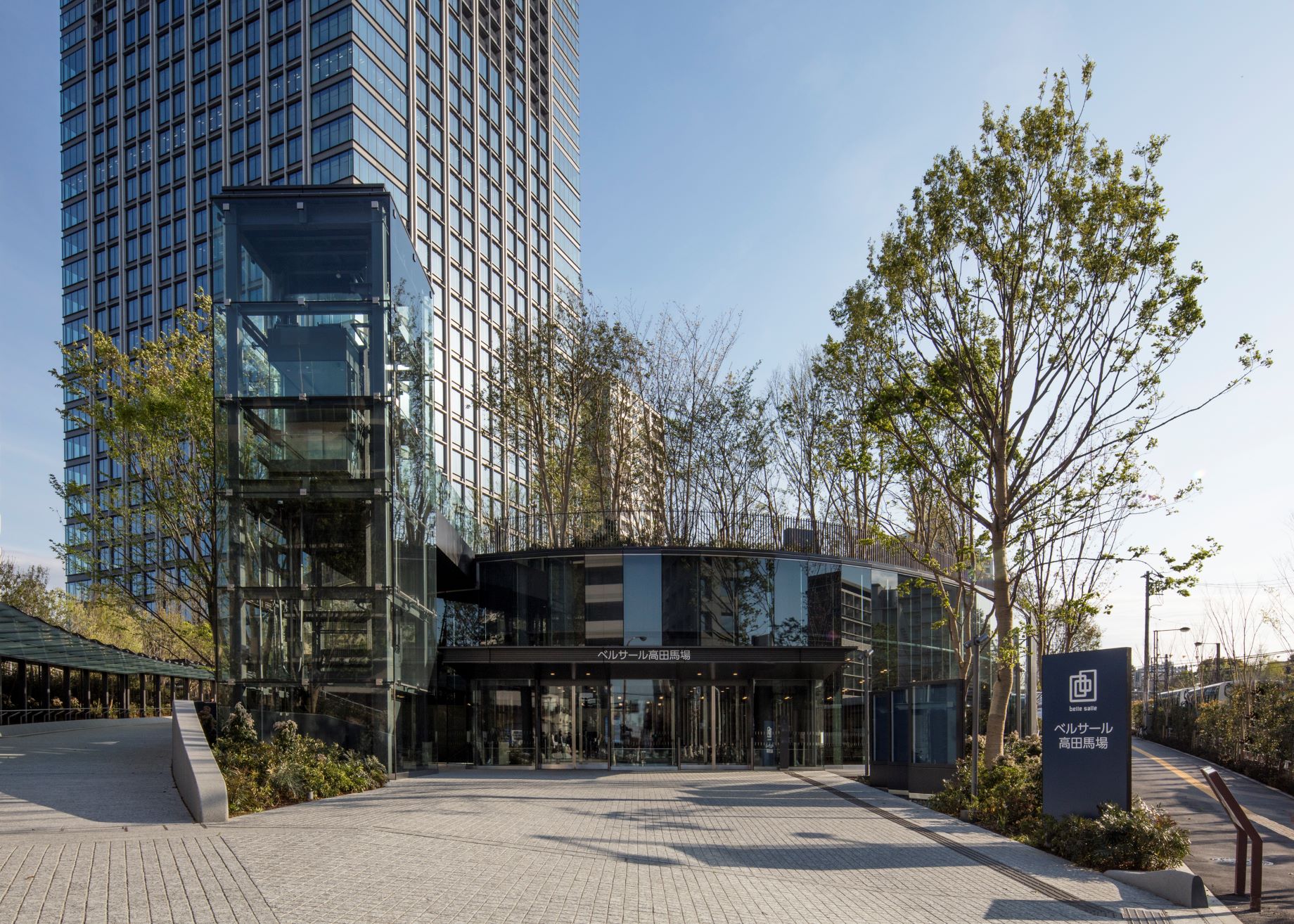 低層部にはオフィス空間、中高層部は賃貸住宅「ラ・トゥール新宿ガーデン」が組み込まれ、複合用途の立体的な構成が外観からも読み取れる構造です。周囲の緑地や広場と連続する外観構成により、歩行者空間への開放感も演出されています。