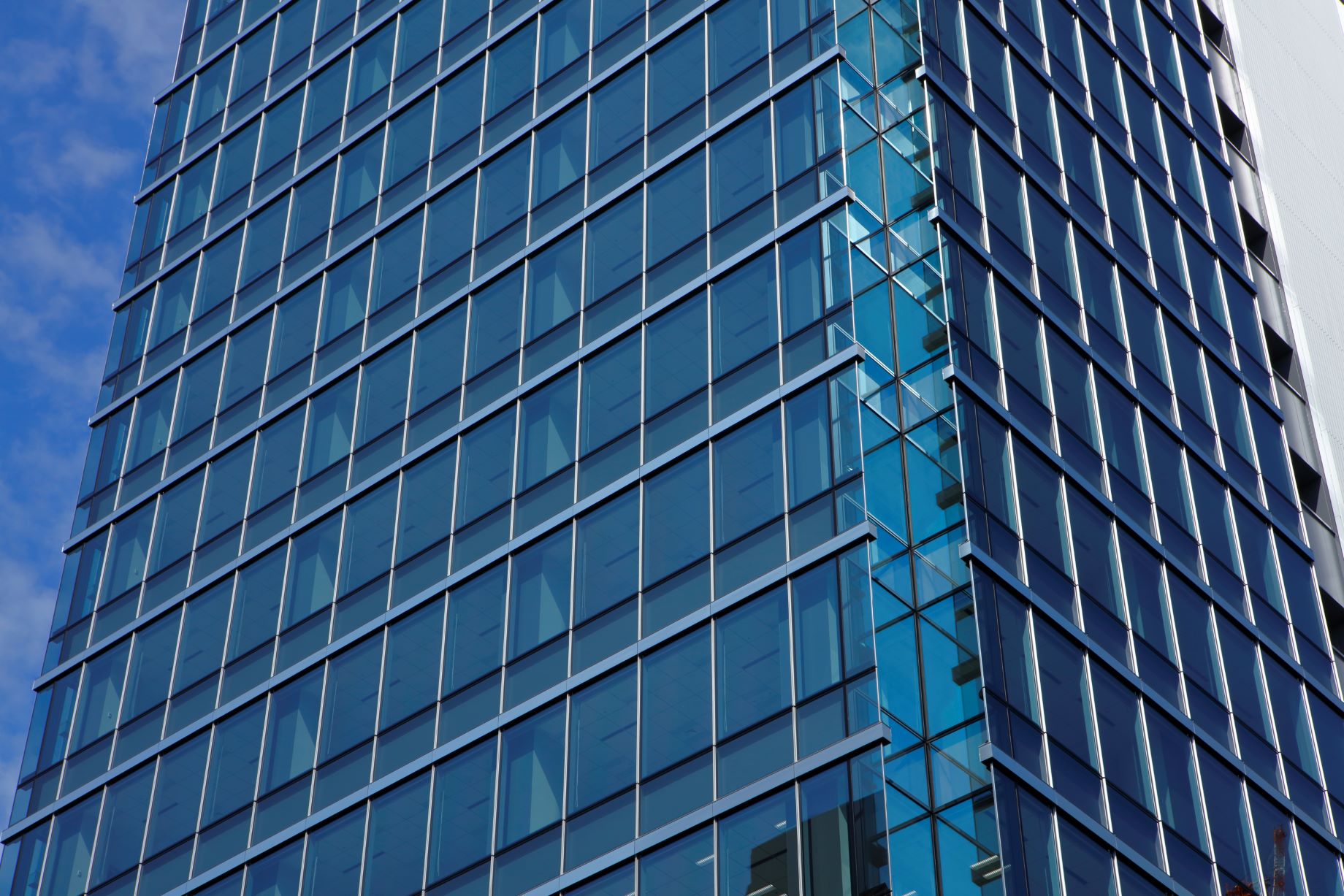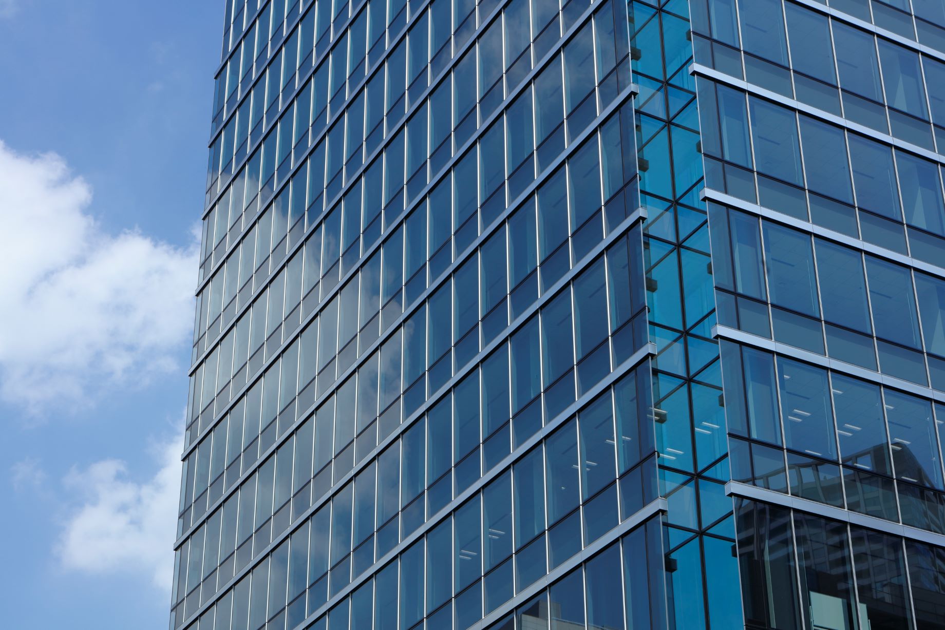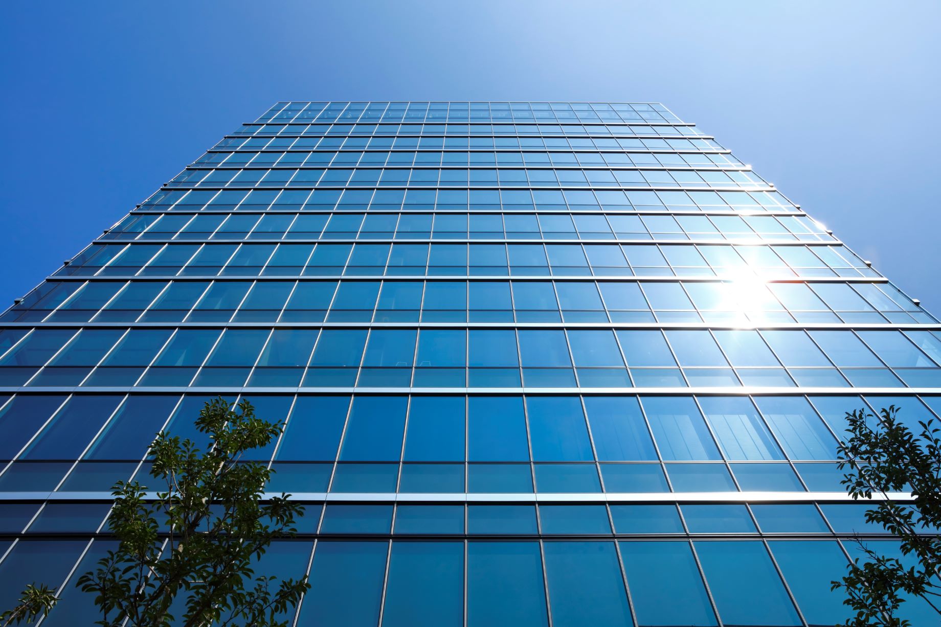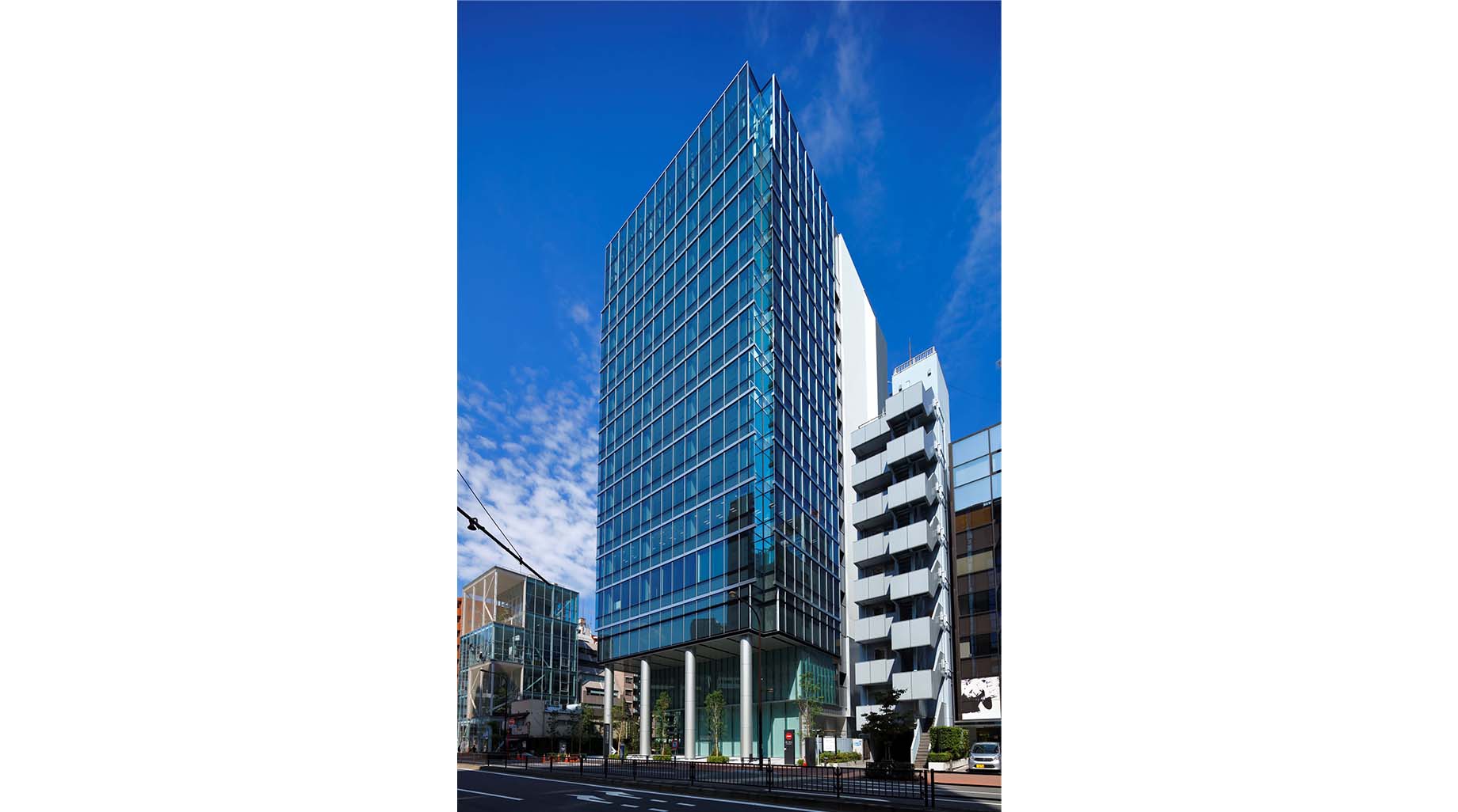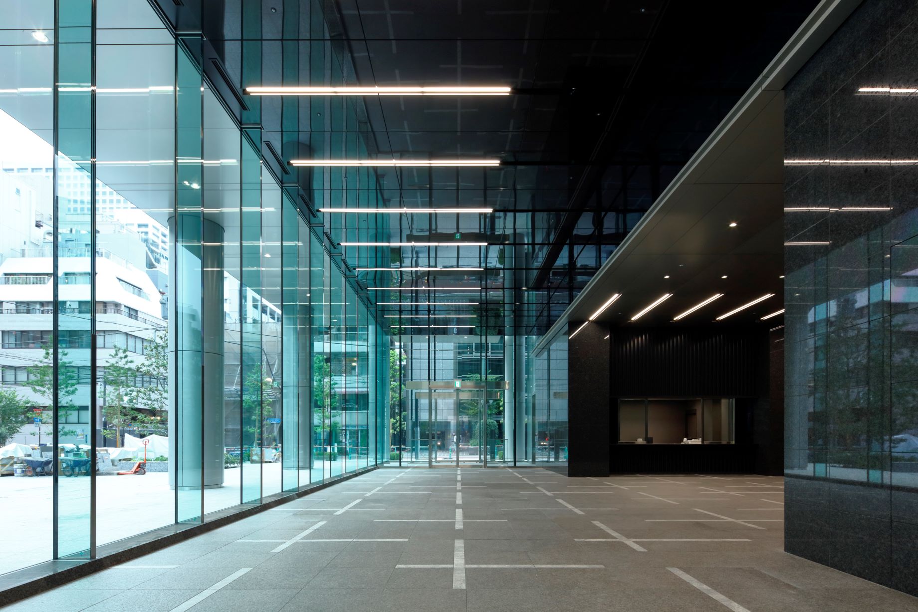 光を適度に取り入れつつ視認性を高めたガラス面と堅牢な構造表現が、ビジネス拠点としての信頼感と洗練された印象を併せ持つ外観を演出。都心のビジネスパークとしての存在感を示しています。