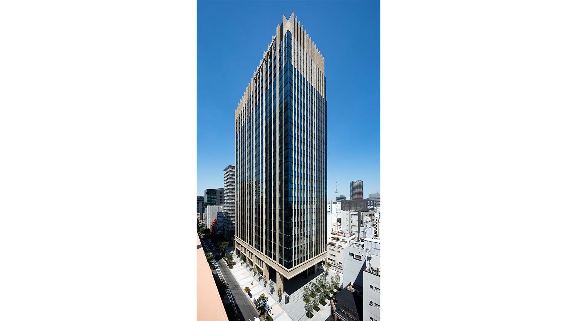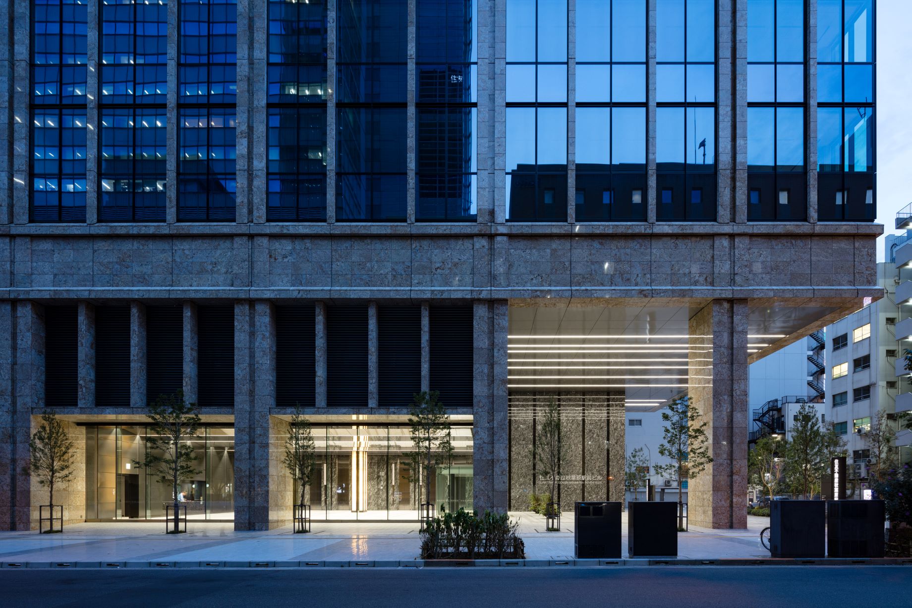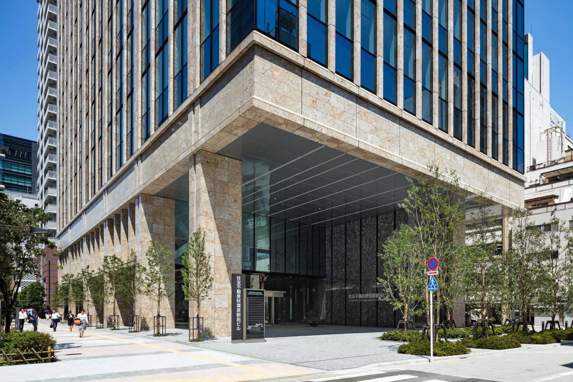 また、低層部は石調の素材と植栽が調和し、エントランス周りに高級感と開放感を演出。免震構造・無停電対応など先進的な機能性も併せ持ち、秋葉原の駅前ランドマークとして機能しています。