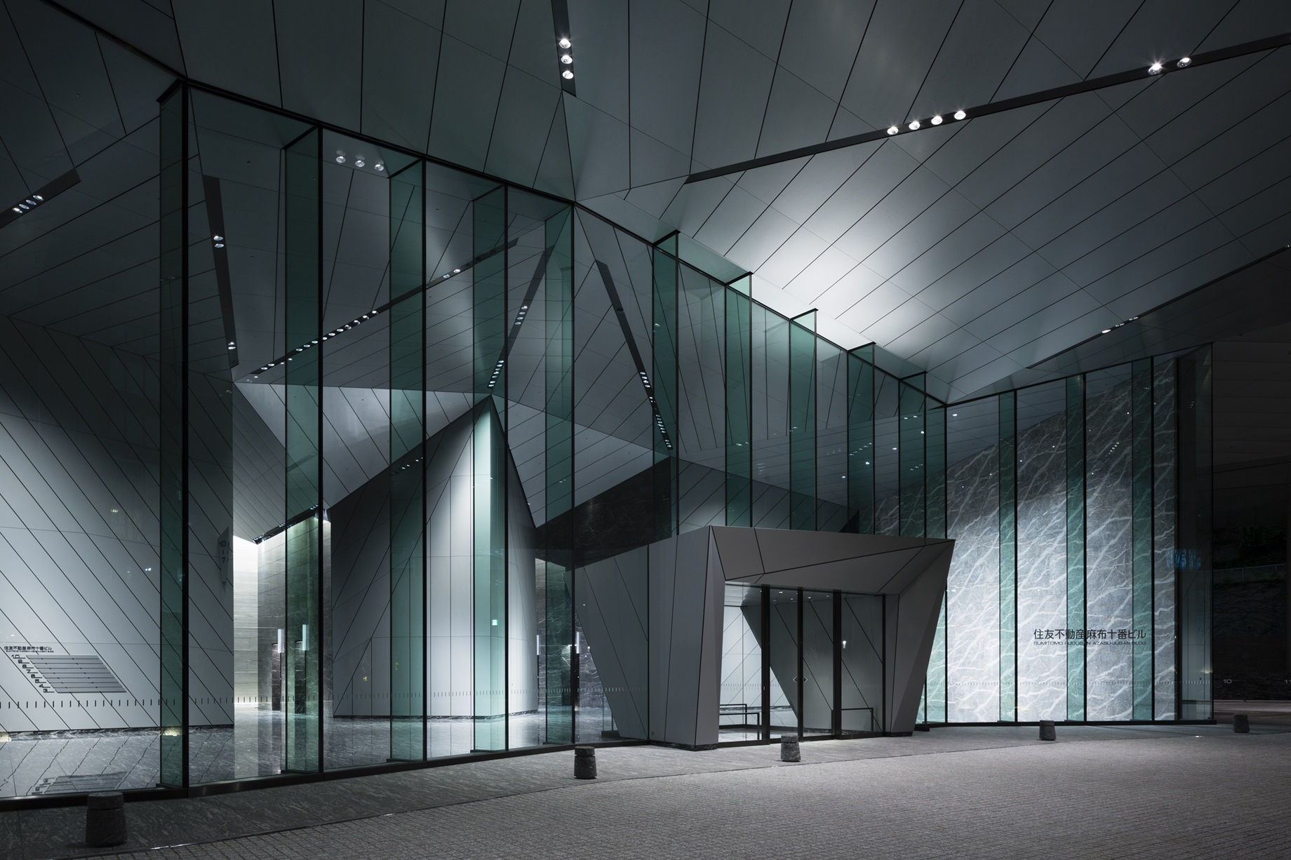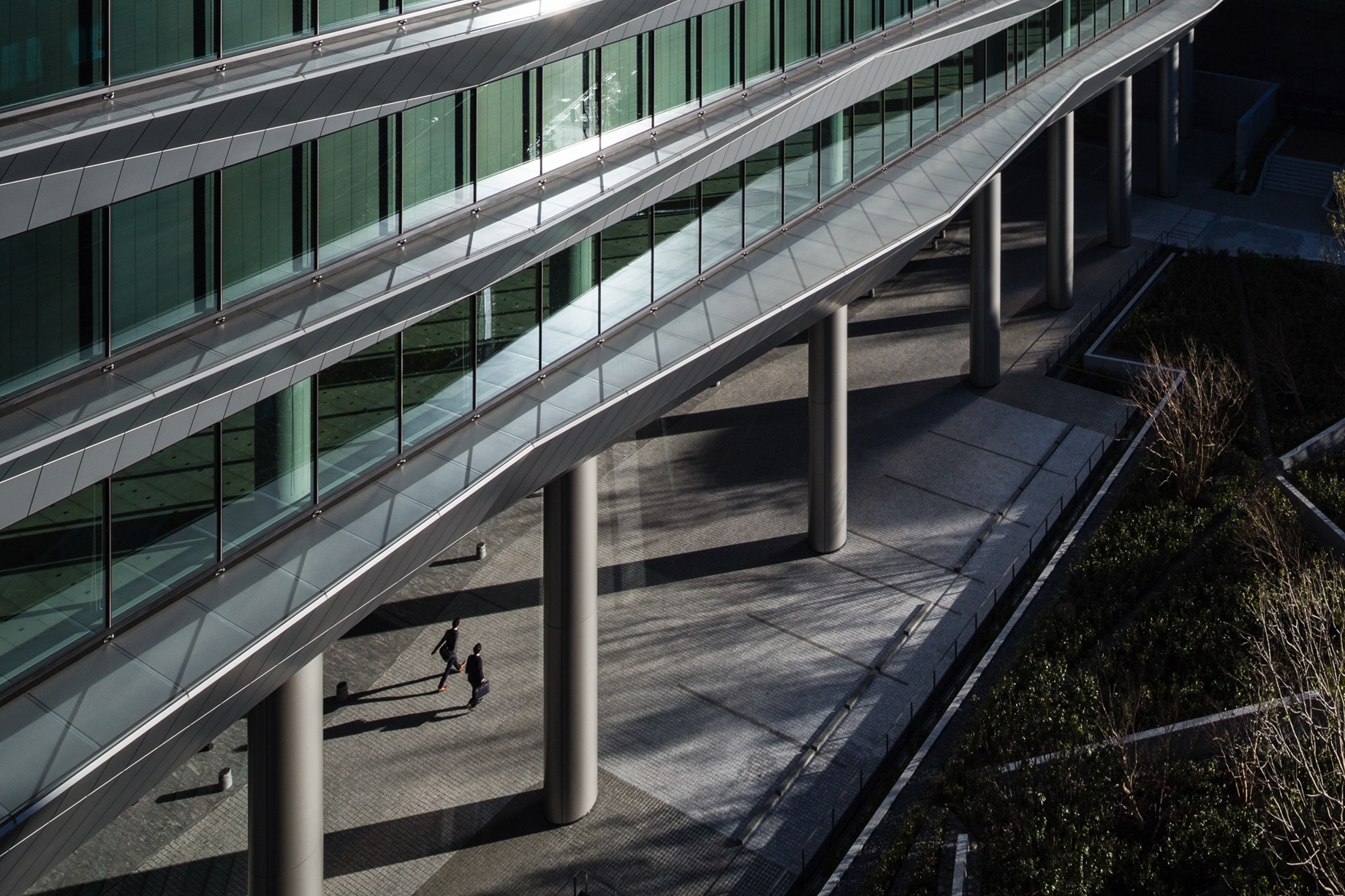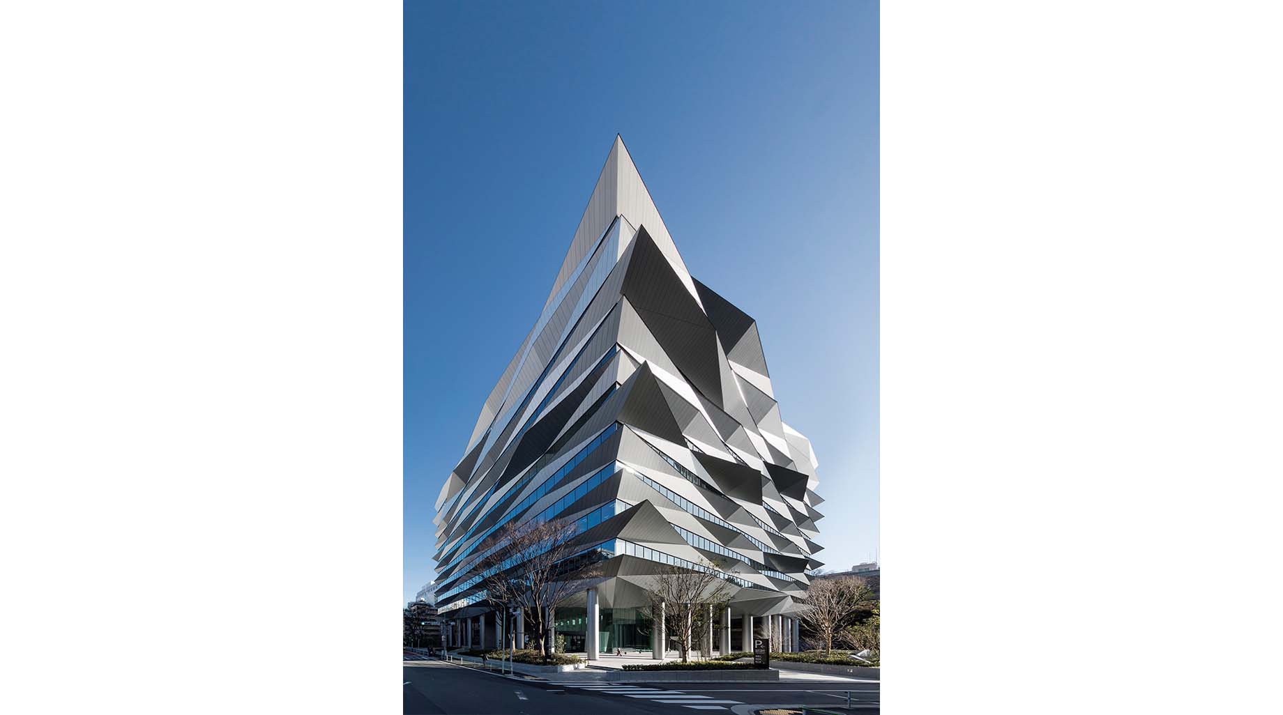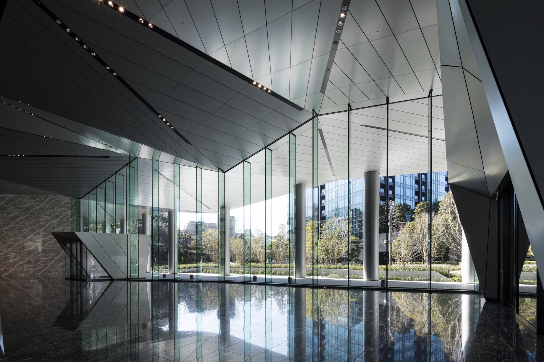 低層部のエントランス周りは視認性と歩行者の導線を重視した構成となっており、ガラス面の透明性が開放感を演出。外観全体にわたり素材とプロポーションの均衡が保たれ、都市のランドマーク性と機能性を両立した外装デザインとなっています。