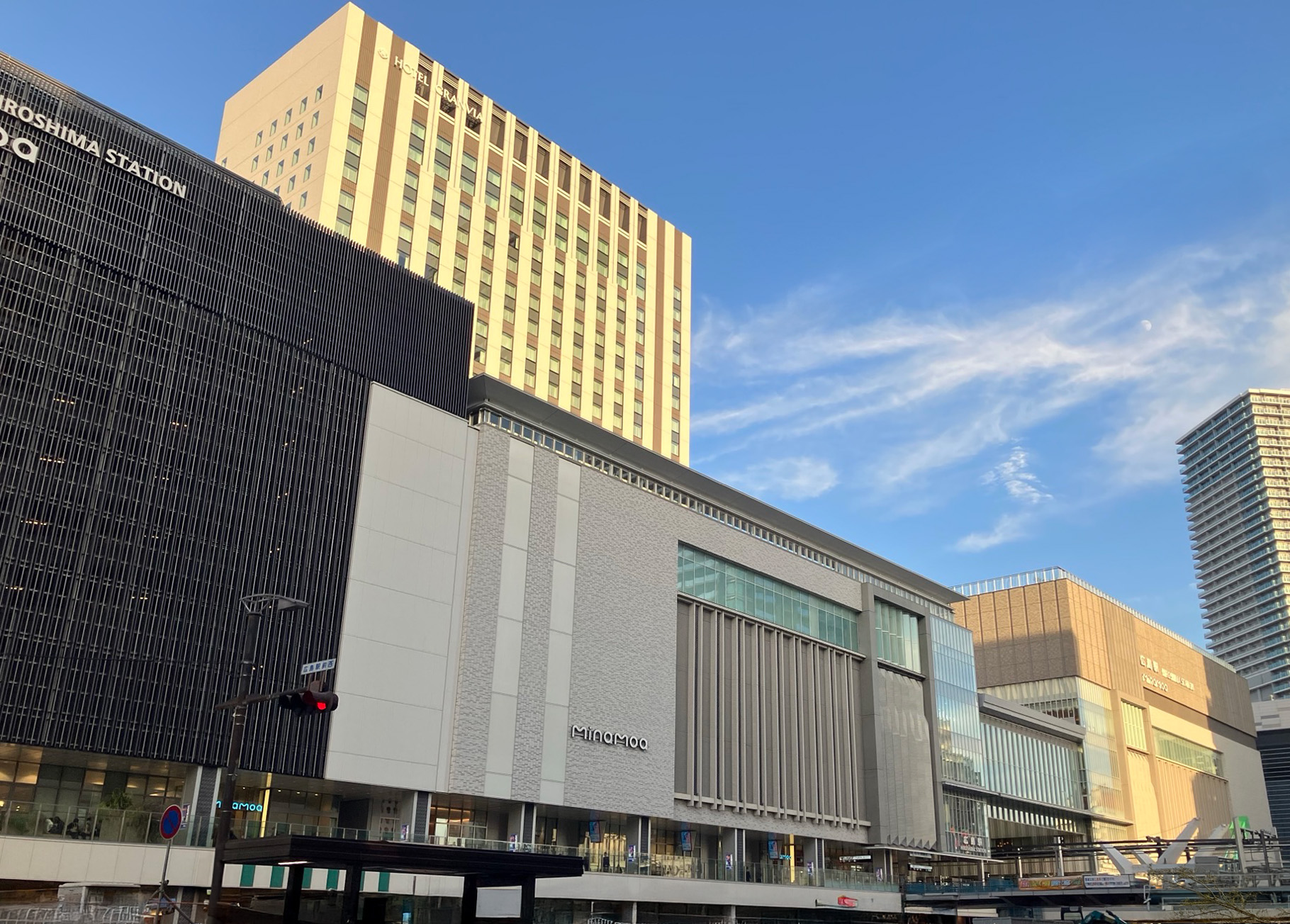 広島駅ビル「minamoa(ミナモア)」は、水面のゆらぎを思わせる柔らかなラインと、大きく開かれたガラス外装が特徴の広島駅直結複合施設です。