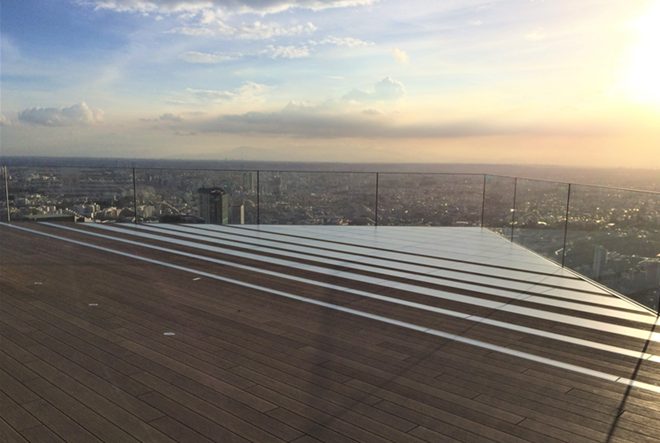 2枚のガラスの間に透明で接着力の強い中間膜を挟んだガラスで、破損時の貫通や破片の脱落を防ぎ、被害を最小限に抑える安全なガラスです。中間膜を厚くすることで防犯性能を高めることが可能です。ガラス小口を露出させるリブガラスなど透明感を引き立たせ開放感あふれる大空間を実現します。また、高層階のエレベーターホールにおいての眺望性や意匠性を高めます。