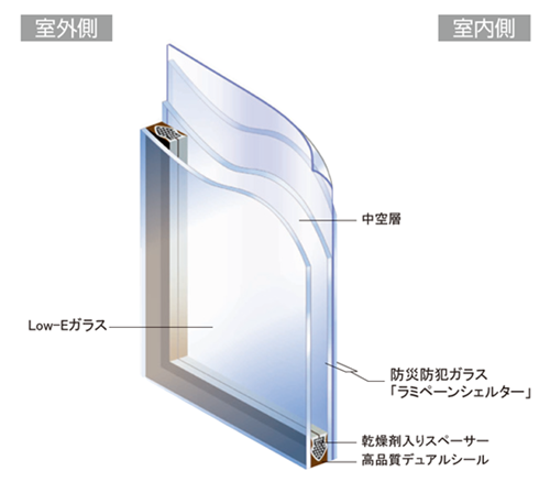 ペアマルチラミシェルターは室内側に「防災防犯ガラス」を使用することに加えて、室外側にLow-Eガラス等を使用したガラスです。