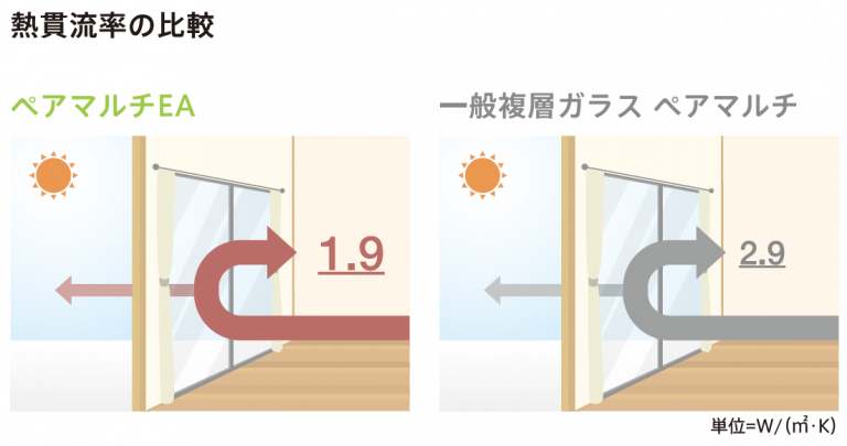 ペアマルチEAの断熱性能は、Low-E膜と中空層の効果でフロート板ガラスの約3. 1倍、一般複層ガラスペアマルチの約1.5倍と高く、室外に逃げる熱が少ないので、暖房負荷の軽減に効果的です。