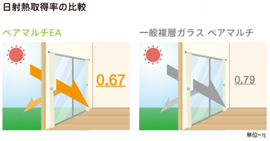 室外側ガラスにコーティングした高断熱Low-E膜が、室内の暖房熱は外に逃がさず、日射熱を室外へ適度に反射させる「日射取得型Low-E複層ガラス ペアマルチEA」。冬の暖房効果、夏の冷房効果を高めて快適に過ごせるだけでなく、透明で自然な色合いですので、明るい空間づくりに最適です。