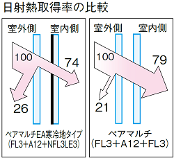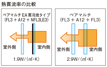 ペアマルチEA寒冷地タイプの断熱性能は、Low-E膜と中空層の効果でフロート板ガラスの約3.1倍、一般複層ガラスペアマルチの約1.5倍と高く、室外に逃げる熱が少ないので、暖房負荷の軽減に効果的です。