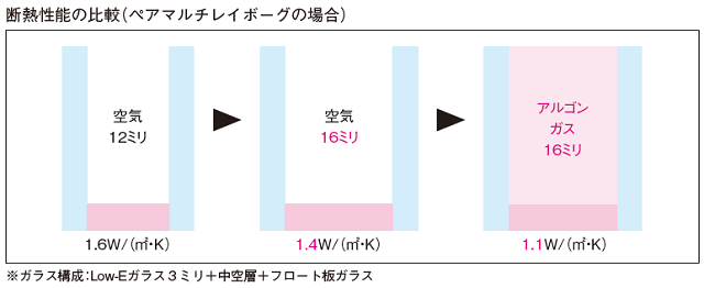 中空層を12ミリから16ミリ幅にすることで、断熱性能が向上します。さらに中空層へ空気のかわりに不活性ガス「アルゴンガス」を封入することで、より断熱性能を向上させることが可能です。