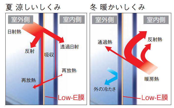 夏は、日射熱の侵入をおさえるので、冷房効率を向上させ、室内を涼しく快適な環境をつくります。また冬は、暖房をしていても暖かいからだの表面から窓ガラス付近の冷気に熱を奪われ寒く感じる「冷輻射」や、足元が冷え冷えする「コールドドラフト現象」をやわらげます。