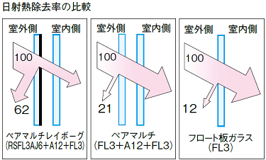 ペアマルチレイボーグは、窓ガラスを通して入ってくる日射熱量を約60%カットします。その性能は一般複層ガラスペアマルチの約3倍。そのため夏の冷房負荷を軽減し、省エネに大きな効果を発揮します。
