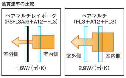 室内と室外に大きな温度差ができることで、ガラス面に結露が発生することがあります。ペアマルチレイボーグは、Low-E膜と中空層による優れた断熱性能によって室内側のガラスの表面温度が下がりにくいため、一般複層ガラスペアマルチと比較しても、さらに結露軽減効果に優れています。