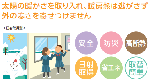 スクールペアエコEAは冬、太陽から暖かい日差しを取り入れ、教室内を暖か く保ちます。また暖房していても外の寒さの影響を受けず、室内側のガラス はあまり冷たくならないので、窓際の寒さを軽減し快適な環境をつくります。
