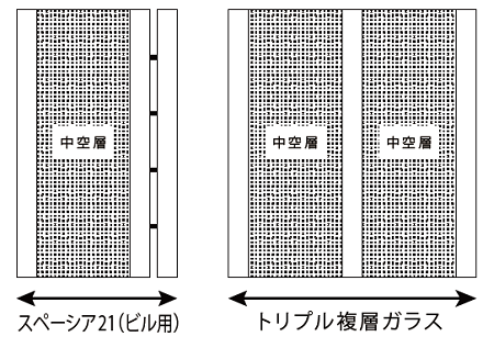 スペーシア21(ビル用)と同等の断熱性能・耐風圧性能を複層ガラスにもたせるには、トリプル複層ガラスとなり厚みも重量も増えてしまいます。スペーシア21(ビル用)ならスリムな設計を実現し、複層ガラス用サッシにも取り付けることが可能です。