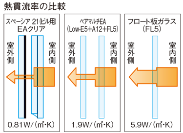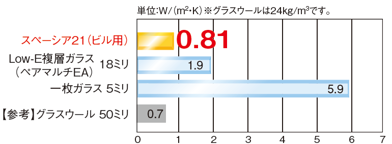 スペーシアにLow-Eガラスを組み合わせた複層真空ガラスのスペーシア21(ビル用)は、グラスウール50mmに匹敵する超高断熱性能を発揮します。